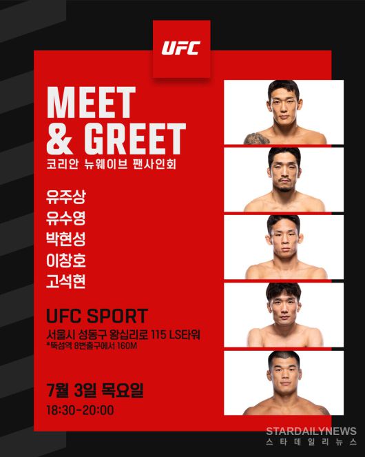 [스타데일리뉴스=김나나기자] 한국 MMA의 새로운 얼굴들이 팬들과의 만남을 예고했다. 오는 7월 3일 오후 6시 30분, 서울 성동구 UFC SPORT 성수점에서 국내 격투기 팬들의 심장을 뛰게 할 UFC 파이터 고석현, 유주상, 박현성, 이창호, 유수영이 팬사인회로 출격한다.