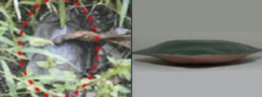 북한의 나뭇잎 지뢰가 매설된 모습(왼쪽)과 나뭇잎 지뢰 모형. /육군참모본부 |