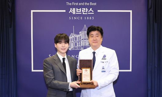 그룹 방탄소년단(BTS)의 슈가(왼쪽)와 금기창 연세의료원장이 23일 서울 마포구 세브란스병원 제중관에서 열린 민윤기 치료센터 착공식에서 기념촬영을 하고 있다. 세브란스병원 제공 |