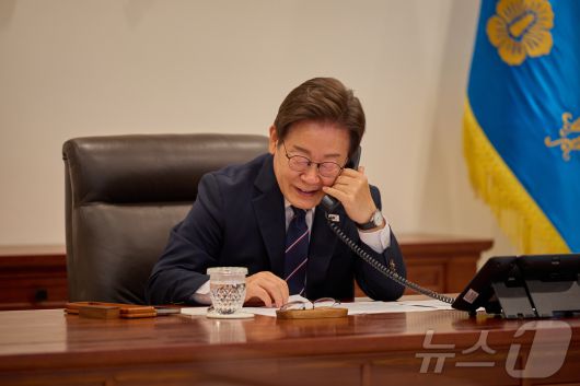 이재명 대통령이 23일 서울 용산구 대통령실 청사 집무실에서 안와르 이브라힘 말레이시아 총리와 전화 통화를 하고 있다. (대통령실 제공. 재판매 및 DB 금지) 2025.6.23/뉴스1 ⓒ News1 허경 기자 |