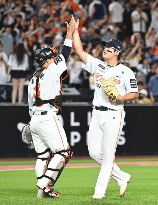 [OSEN=대전, 김성락 기자] 프로야구 한화 이글스가 더블 스틸에 이어 이도윤의 역전 결승타가 터지며 위닝시리즈를 확보했다.한화는 4일 대전 한화생명볼파크에서 열린 2025 신한 SOL Bank KBO리그 KT 위즈와의 홈경기를 4-3으로 승리했다.승리가 확정된 순간 한화 김서현, 최재훈이 기쁨을 나누고 있다. 2025.06.04 / ksl0919@osen.co.kr |