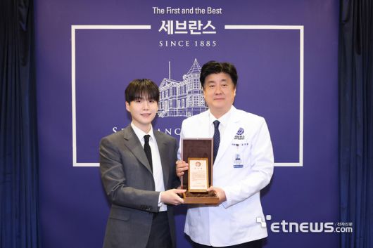금기창 연세의료원장(오른쪽)과 BTS 슈가(왼쪽)가 기념 사진을 촬영하고 있다. |