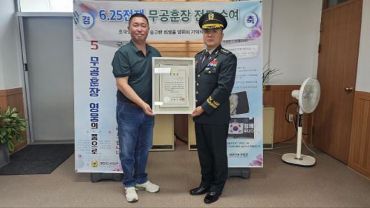 박성기 무안군 현경면사무소 민원팀장이 최근 6·25 전쟁 무공훈장 찾아주기 조사단장으로 부터 할아버지(고 박종열 소령)의 금성화랑 무공훈장을 수여 받았다. /무안군 |
