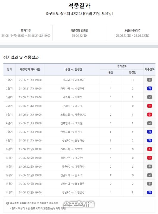 축구토토 승무패 42회차 적중결과. 사진 | 스포츠토토 |