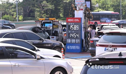 미국이 지난 주말 이란 핵시설을 공습하고 이란이 세계 주요 원유 수송로인 호르무즈 해협 봉쇄에 나설 것이란 우려로 국제유가가 3% 넘게 급등했다. 23일 서울 만남의광장 주유소에서 주유를 하기 위해 차량들이 줄지어 서 있다.