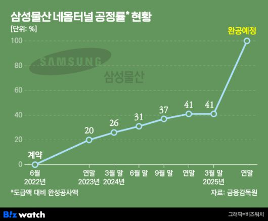 그러나 올해 1분기에도 공정률은 41%에 머물렀습니다. 3개월 동안 공사에 별다른 진전이 없던 것으로 파악됩니다. 올해 말이 완공 시점이나 이를 지키기는 공기가 빠듯합니다. 삼성물산 측은 "진척이 더디다"며 말끝을 흐렸습니다.