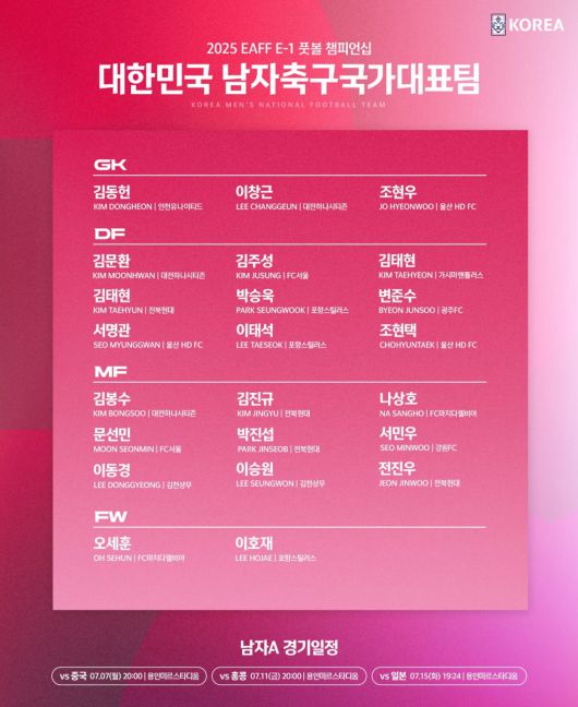 (엑스포츠뉴스 김정현 기자) 올 여름 한국에서 열리는 2025 동아시아축구연맹(EAFF) E-1 챔피언십(동아시안컵)에 나설 한국 남·녀 축구대표팀 명단이 공개됐다.