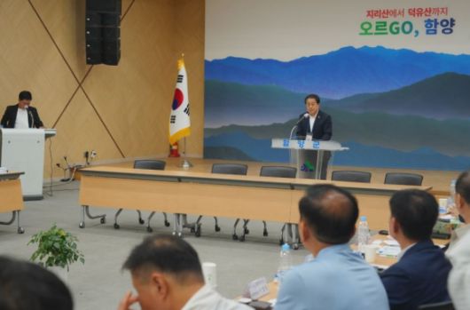 지난 21일 경남 함양군청 대회의실에서 개최된 (사)서울시상점가·전통시장연합회, (사)서울시소상공인중앙회 및 함양한들자율상권조합 간의 업무협약(MOU) 체결식에서 김용호 의원이 축사하고 있다. |