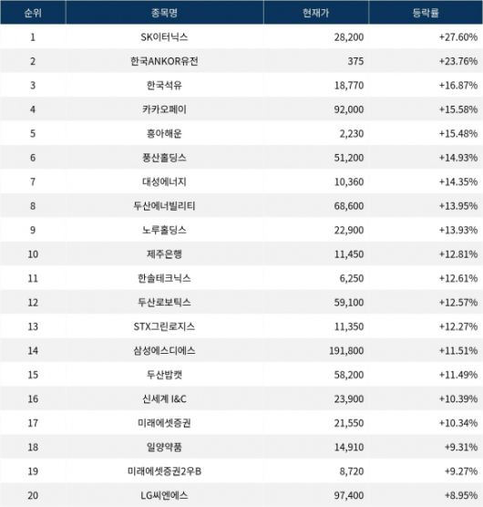 이어 상승률 2위 한국ANKOR유전(152550)은 주가가 23.76% 폭등하며 종가 375원에 상승 마감했다. 상승률 3위 한국석유(004090)의 주가는 18,770원으로 16.87% 급등하며 강세를 보였다. 상승률 4위 카카오페이(377300)는 15.58% 급등하며 92,000원에 마감했다. 상승률 5위 흥아해운(003280)은 15.48%의 상승세를 타고 종가 2,230원에 마감했다.