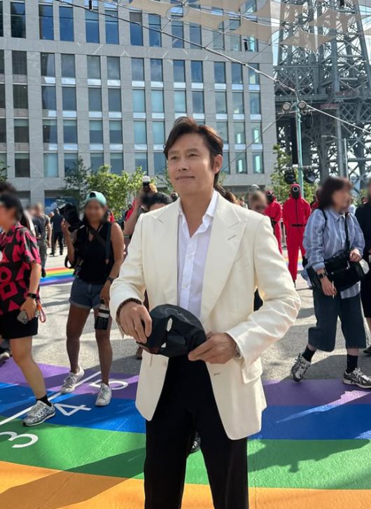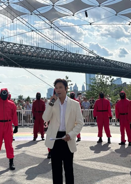공개된 사진 속 이병헌은 흰색 재킷과 검은색 정장 바지를 깔끔하게 차려입고 ‘오징어 게임’ 속 프론트맨의 상징인 검은 가면으로 얼굴을 가린 채 등장하고 있다. 그의 뒤로는 시리즈의 마스코트인 붉은 옷을 입은 진행 요원들이 함께하며 마치 드라마의 한 장면 같은 압도적인 분위기를 연출했다.