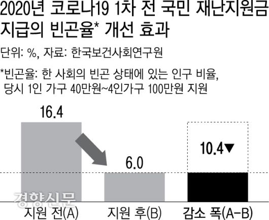 과거 연구 결과를 보면, 전국민지원금은 빈곤·불평등 완화에 확실한 효과를 보인 것으로 나타났다. 보건사회연구원이 2021년 발간한 보고서를 보면, 문재인 정부가 1차 전국민재난지원금을 지급하기 전 빈곤율은 16.4%였으나 재난지원금 지급 후 6%로 10.4%포인트 급감했다. 전국민재난지원금 지급 직후 전체 인구에서 빈곤층이 차지하는 비율이 절반 이하로 떨어진 것이다. 같은 해 9월 실시한 2차 재난지원금의 ‘핀셋’ 지원은 특수고용직 노동자의 빈곤율을 최대 14.9%, 자영업자의 빈곤율은 6.3%포인트 떨어뜨렸다.