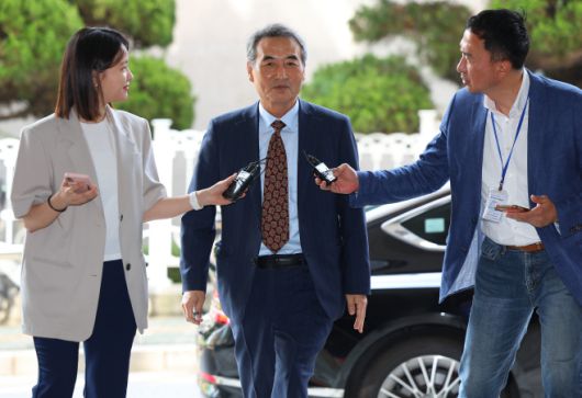윤석열 전 대통령 부인 김건희 여사 관련 의혹을 수사하는 민중기 특별검사가 23일 서울 서초구 서초동에 마련된 임시 사무실로 출근하며 취재진 질문에 답하고 있다./연합뉴스 |