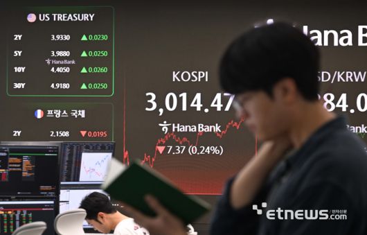 미국이 지난 주말 이란 핵시설을 공습하며 중동 정세 불안으로 23일 국내 증시는 장 초반 3천선 아래로 하락했다 회복했고 원·달러 환율은 10원 이상 급등했다. 이날 서울 중구 하나은행 딜링룸. 박지호기자 jihopress@etnews.com [Copyright © 전자신문. 무단전재-재배포금지]