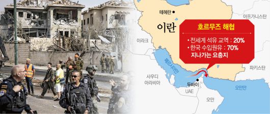 사진은 이스라엘 네스지오나에서 22일(현지시간) 보안군이 이란의 미사일 공격으로 파손된 주택 앞에 집결해 있다. 이란은 미국의 핵시설 공습에 대한 보복 일환으로 이날 이스라엘을 향해 두 차례 미사일 공격을 가했다. 이란 의회는 같은 날 호르무즈해협을 봉쇄하는 결의안을 가결했다. 최종 결정권을 지닌 이란최고국가안보회의(SNSC)가 승인하게 되면 세계 석유 이동량의 약 5분의 1을 책임지는 길목이 막히게 된다. 네스지오나(이스라엘)/AFP연합뉴스 |
