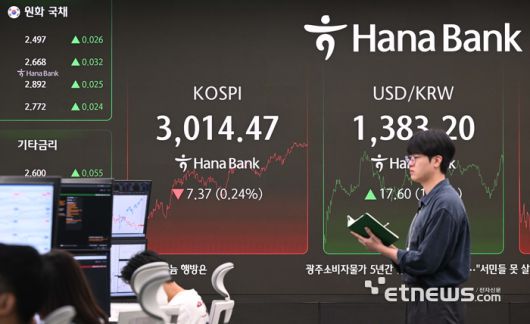 미국이 지난 주말 이란 핵시설을 공습하며 중동 정세 불안으로 23일 국내 증시는 장 초반 3천선 아래로 하락했다 회복했고 원·달러 환율은 10원 이상 급등했다. 이날 코스피는 전날 종가보다 7.37 포인트(0.24%) 하락하며 3,014.47로, 원·달러 환율은 전날 대비 18.40원 상승한 1,384.00원에 거래를 마감했다. 이날 서울 중구 하나은행 딜링룸.