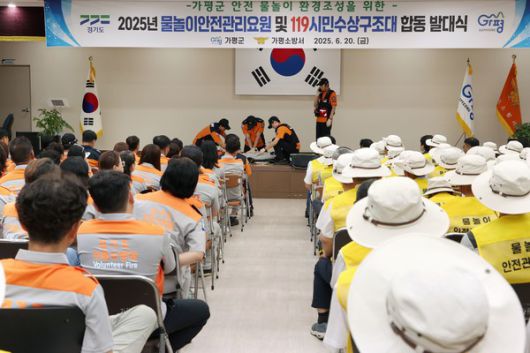 (가평=국제뉴스) 이재호 기자 = 가평군은 20일, 가평소방서와 공동으로 '2025년 물놀이 안전관리요원 및 119시민수상구조대 합동발대식'을 개최했다.