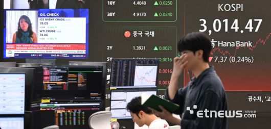 미국이 지난 주말 이란 핵시설을 공습하며 중동 정세 불안으로 23일 국내 증시는 장 초반 3천선 아래로 하락했다 회복했고 원·달러 환율은 10원 이상 급등했다. 이날 코스피는 전날 종가보다 7.37 포인트(0.24%) 하락하며 3,014.47로, 원·달러 환율은 전장 대비 18.40원 상승한 1,384.00원에 거래를 마감했다. 이날 서울 중구 하나은행 딜링룸.