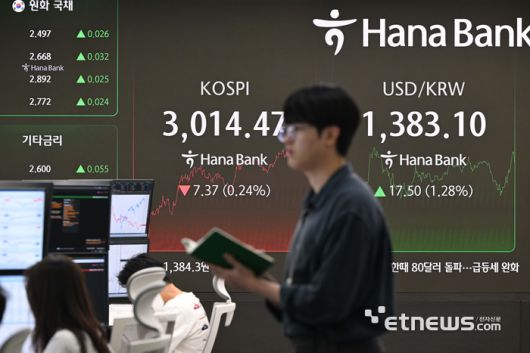 미국이 지난 주말 이란 핵시설을 공습하며 중동 정세 불안으로 23일 국내 증시는 장 초반 3천선 아래로 하락했다 회복했고 원·달러 환율은 10원 이상 급등했다. 이날 코스피는 전날 종가보다 7.37 포인트(0.24%) 하락하며 3,014.47로, 원·달러 환율은 전장 대비 18.40원 상승한 1,384.00원에 거래를 마감했다. 이날 서울 중구 하나은행 딜링룸.