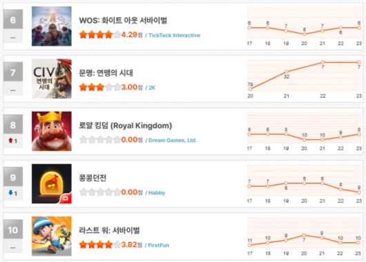 한동안 10위권 밖으로 밀려났던 ‘라스트 워: 서바이벌’은 다시 10위로 복귀하며 아슬아슬하게 체면을 세웠다. 장르 특유의 생존 전략 요소가 마니아 층을 중심으로 여전히 소구력을 갖고 있는 것으로 보인다.