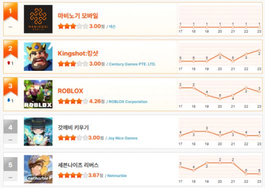 한편, 오랜 기간 1위를 지켜왔던 ‘세븐나이츠 리버스’는 점차 순위가 하락하며 이번 주에는 5위까지 밀려났다. ‘로블록스’와 ‘킹샷’이 각각 2위와 3위로 올라서며, 조용히 탄탄한 팬층의 저력을 보여주는 데 성공했다.