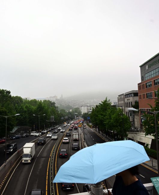 평년보다 일주일 일찍 장마가 시작된 가운데 지난 16일 오전 서울 용산구 녹사평육교에서 바라본 남산이 비구름에 가려 보이지 않고 있다. 이상섭 기자 |