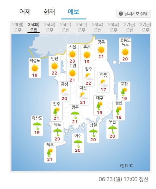 기상청에 따르면 23일 밤 제주도부터 시작된 비는 내일(24일) 새벽 전남권과 경남권, 오전에는 전북과 경북 남부, 오후에는 경기 남부·충청권·강원 중남부, 밤부터는 서울과 경기 북부, 강원 북부까지 확대될 것으로 보인다.