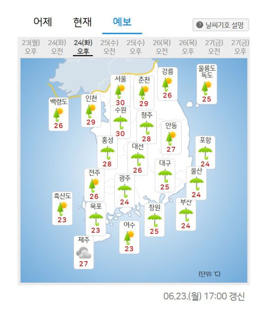 (MHN 이주환 기자) 월요일인 내일(24일)은 정체전선의 영향으로 전국 대부분 지역에 비가 내릴 것으로 예상된다. 특히 남부지방은 새벽부터, 중부지방은 오후부터 비가 시작돼 차차 전국으로 확대되겠으며, 수도권을 중심으로는 낮 기온이 30도 안팎까지 오르며 더위가 체감될 전망이다.