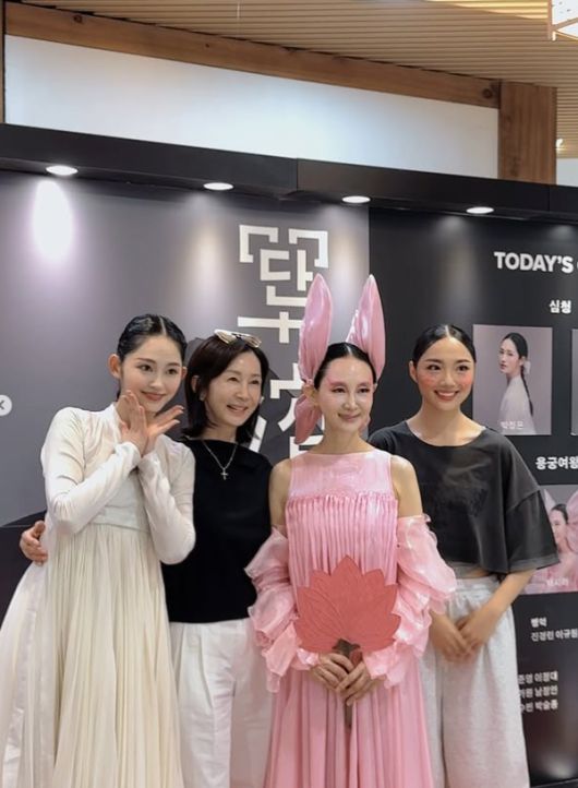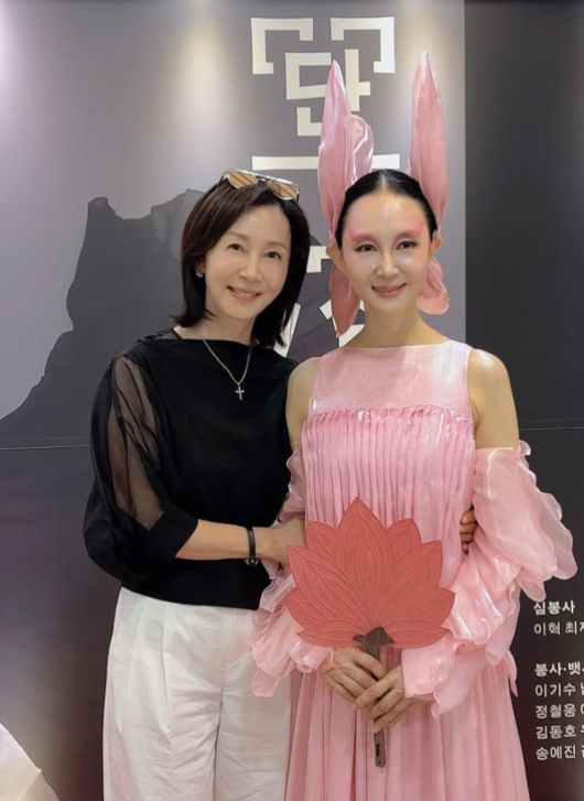 사진 속 채시라는 화려한 분홍색 무대 의상과 독특한 머리 장식, 짙은 화장으로 인형 같은 비주얼을 뽐내고 있다. 그의 곁에서 환하게 웃고 있는 전인화는 시스루 소매의 검은색 상의와 흰색 바지를 매치해 우아하고 고급스러운 매력을 발산했다.