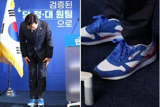 6월 12일 더불어민주당 이재명 대통령 후보가 6·3 대통령선거 공식 선거운동 첫날인 12일 서울 광화문 청계광장에서 열린 출정식에서 운동화를 신고 있다./뉴스1 |