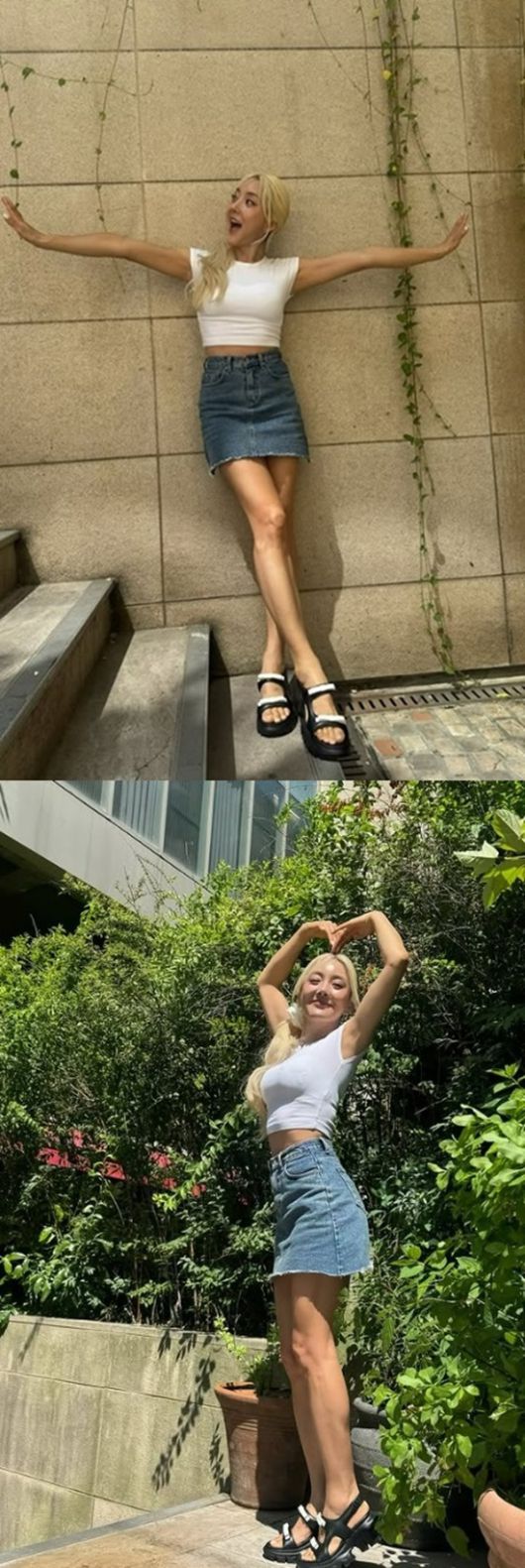 공개된 사진에는 금발의 헤어스타일과 크롭티, 데님 미니스커트로 패션을 완성한 바다가 카메라를 바라보며 밝게 미소 짓고 있는 모습이 담겨 있다.