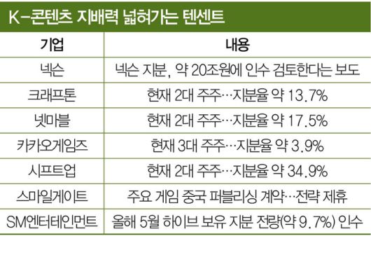 넥슨뿐 아니다. 텐센트는 수년 전부터 야금야금 국내 게임·콘텐츠 생태계 전반에 영향력을 키워오는 중이다. 3N(넥슨·엔씨소프트·넷마블)과 2K(크래프톤·카카오게임즈)로 대표되는 한국 주요 게임 기업 중 3곳은 이미 텐센트가 2~3대 주주로 있다.