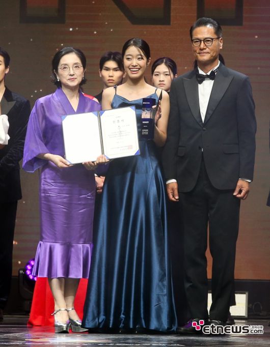 모델 박지연이 위너에 선정되었다. 전 서울시의원 이혜경, 한국모델협회 임주완 회장이 포즈를 취하고 있다.
