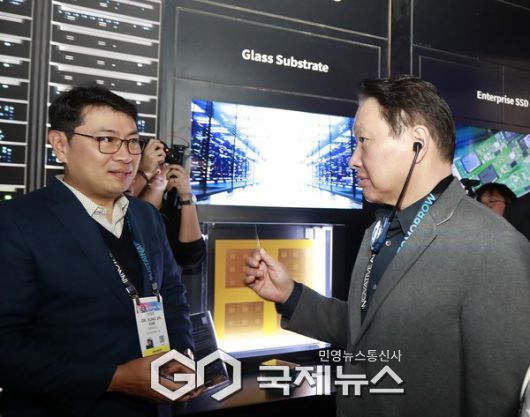 최태원 SK 회장이 지난 1월 미국 라스베이거스에서 열린 'CES 2025' 행사장에 마련된 SK 전시관에서 유리기판을 살펴보고 있다 |