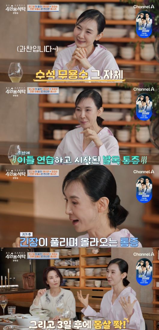 정경순이 "아픈 적은 없냐"고 묻자 채시라는 "초반에 이틀 연습하고 발등하고 발바닥이 후끈거렸다. 안 되는 동작을 될 때까지 하느라고 막 하다 보니 그 당시에는 몰랐는데 집에 오니까 30분 전에도 안 아팠던 발이 욱씬거렸다"고 답했다.