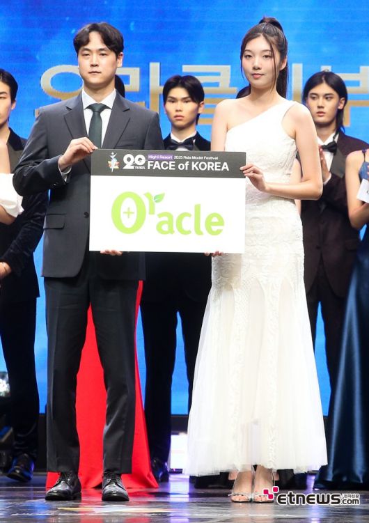 모델 정지원이 오라클피부과상을 수상했다 시상자 오라클피부과 노평근 상무와 포즈를 취하고 있다.