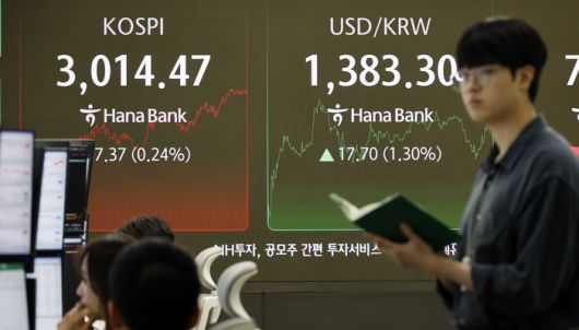 23일 오전 서울 중구 하나은행 딜링룸 전광판에 코스피 지수가 표시되고 있다. 이날 코스피는 미국의 이란 타격 등 대내외 악재에 3000선을 내주며 약세로 출발했다. 지난주 말 3년 반 만의 3000선 회복 후 거래일 기준 하루 만이다. [사진 = 뉴스1]