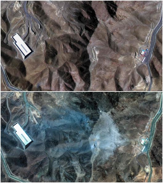 미국의 이란 포르도 핵 기지 공습 전후 모습.아래 사진이 공습후 모습이다. /Maxar Technologies |