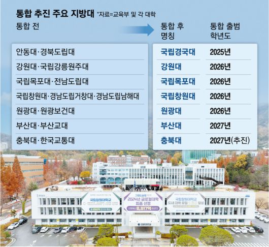 지난 5월에는 9개 국공립대학교가 4개 대학으로 통합 승인됐다. 강원대와 국립강릉원주대가 ‘강원대학교’로, 국립목포대와 전남도립대가 ‘국립목포대학교’로, 국립창원대와 경남도립거창대·경남도립남해대가 ‘국립창원대’로, 부산대와 부산교육대가 ‘부산대학교’로 통합 승인됐다. 2027년 3월 개교하는 부산대를 제외한 나머지 세 개 대학은 모두 내년 3월에 개교한다.