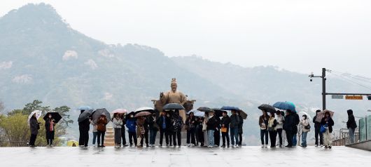 24일부터 25일까지 전국에 비가 내릴 것으로 예보됐다. 2025년 4월 14일 오전 서울 종로구 광화문 광장에서 우산을 쓴 외국인 관광객들이 이동하고 있다. /뉴스1 |
