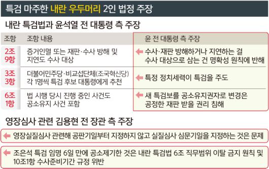 윤석열 전 대통령은 23일 내란 재판에 출석해 자신을 수사하는 특별검사팀과 처음 마주했다. 윤 전 대통령 측은 이 자리에서 특검법부터 헌법 위배 소지가 있다며 헌법재판소에 문제를 제기할 방침이라고 했다. 특검 수사를 문제 삼고 있는 김용현 전 국방부 장관의 구속 연장 여부는 구속기간 만료(26일) 직전 결정될 것으로 보인다.