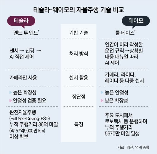 반면 테슬라는 8개의 카메라만으로 실시간 도로 환경을 인식해 고정밀 지도에 의존하지 않고도 주행할 수 있다는 점이 차별화된다. 테슬라의 고도화된 자율주행기능 ‘FSD’(Full Self-Driving·완전자율주행)로 이동한 누적 주행거리가 3월까지 36억 마일(약 57억9000만 km)로 웨이모(5670만 마일)의 약 64배에 달한다는 점도 강점으로 꼽힌다.