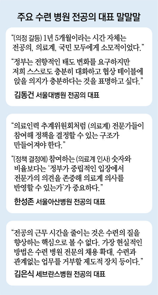 전공의 대표 3명은 수련병원 복귀 조건을 구체적으로 제시했다. 한성존 대표는 의료계 정책 결정과 관련해서 “의료인력 추계 위원회처럼 (의료계) 전문가들이 참여해 정책을 결정할 수 있는 구조가 만들어져야 한다”며 “위원회에 참여하는 (의료계 인사) 숫자와 비율보다는 ‘정부가 중립적인 입장에서 전문가의 의견을 존중해 의료계 의사를 반영할 수 있는가’가 중요하다”고 말했다. 김은식 대표는 “전공의 근무 시간을 줄이는 것은 수련의 질을 향상하는 핵심으로 볼 수 없다”며 “가장 현실적인 방법은 수련병원 전문의 채용 확대, 수련과 관계없는 업무를 거부할 제도적 장치 등이다”라고 말했다.