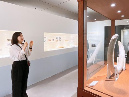 인천시립박물관 직원이 시베리아 대륙에서 수집된 매머드 상아에 대해 설명하고 있다. 이 상아는 일제강점기 당시 일본군이 수집해 인천의 한 창고에 보관하다가, 광복 후 발견돼 박물관으로 옮겨졌다. 인천시립박물관 제공 |