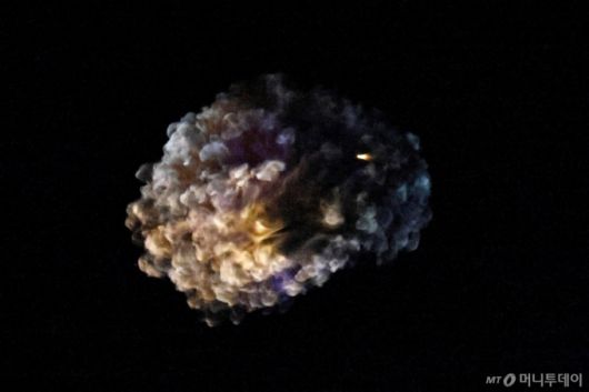 지난 18일(현지시간) 이스라엘 아슈켈론 상공에서 아이언돔 방송 시스템에 의해 요격되는 이란 미사일. 요격 미사일은 적 미사일에 근접해 공중에서 폭발하며 파편을 퍼뜨려 상대 미사일을 파괴한다. 이때 폭발 연기와 파편 구름이 마치 뭉개구름처럼 보이게 된다. /아슈켈론 로이터=뉴스1 |