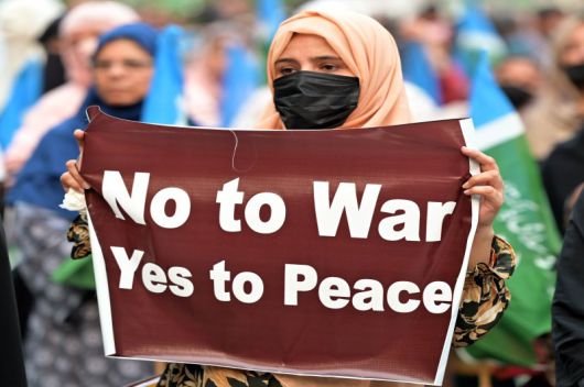 파키스탄 라호르에서 23일(현지시간) 시위대가 이란과 연대하는 한편 전쟁에 반대하고 평화를 추구한다는 구호가 담긴 팻말을 들고 시위하고 있다. 이란이 이날 카타르와 이라크 미군 기지를 공습했지만 사전 통보로 인명 피해가 나지 않으면서 국제 유가는 7% 넘게 폭락했다. EPA 연합 |
