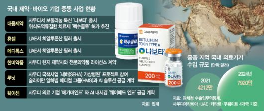 지난해 기준 중동 지역에 대한 국내 의약품 수출 규모는 약 2억 달러로 전체 수출액 92억 달러 중 비중은 적다. 하지만 최근 국내 제약·바이오 업계, 특히 의료기기업계는 중동을 새로운 타깃으로 정하고 공격적으로 진출해왔다. 관세청 수출입무역통계에 따르면 사우디아라비아, 아랍에미리트(UAE), 카타르, 쿠웨이트 4개국의 국내 의료기기 수입 규모는 2021년 4212만 달러에서 지난해 7920만 달러로 3년 새 88% 증가했다. 중동 국가들이 최근 풍부한 오일머니를 바탕으로 낙후된 의료시설 및 장비를 교체하는 가운데 국내 의료기기 제품이 미국·유럽 제품 대비 뛰어난 품질과 가격 경쟁력을 인정받고 있는 영향이다.