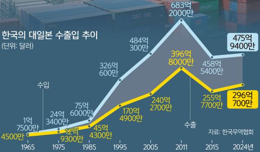 한국과 일본은 1965년 수교 후 60년간 무역, 기술이전, 자본 투자 등을 통해 경쟁과 협력을 반복하며 함께 경제성장을 일궜다. 이 사이 양국의 무역규모는 352배 성장했고 대일 무역적자도 점차 줄어들며 수평적 관계로 나아가고 있다.