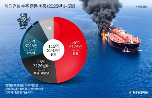 중동은 한국 해외 건설 수주에서 역사적으로 절반 이상을 차지하는 핵심 시장이다. 해외건설협회에 따르면 올해 1월부터 지난달까지 한국 기업의 해외건설 수주액은 총 116억2247만달러(약 16조437억원)로, 이 가운데 중동이 56억4174만달러(약 7조7890억원)로 전체의 48.5%를 차지했다.