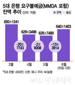 23일 금융권에 따르면 지난 20일 기준 5대 은행(KB국민·신한·하나·우리·NH농협)의 요구불예금(MMDA 포함) 잔액은 640조1403억원으로 집계됐다. 이는 지난달 말 대비 약 13조3914억원 증가한 수준이다. 지난 4월과 5월 두 달 동안 약 23조원 넘게 이탈했으나 다시 대폭 증가 전환했다.