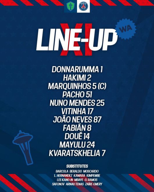 이날 PSG는 세니 마율루를 필두로 흐비차 크바르츠헬리아, 데지레 두에, 파비안 루이스, 비티냐, 주앙 네베스, 누누 멘데스, 윌리안 파초, 마르퀴뇨스, 아치라프 하키미가 선발 출전했다.